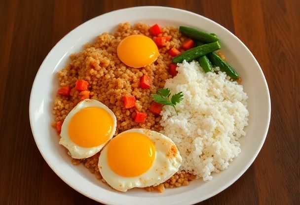 De Nasi met Ei is zo'n simpel maar effectief gerecht. Soms zijn de eenvoudigste dingen het lekkerst - rijst, ei, wat groenten en je bent klaar!