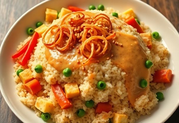 Een heerlijke mix van romige pindasaus, verse groenten en gekruide rijst. Geserveerd met gebakken uitjes voor extra crunch en smaak. Perfect voor wie van een beetje extra's houdt. Ontdek het Nasi Goreng met Pindasaus recept