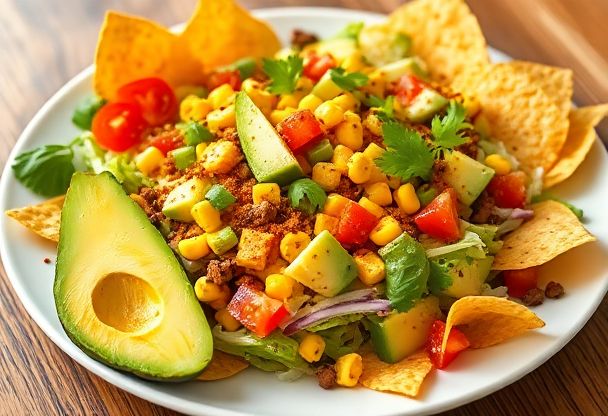 Fris, kleurrijk en klaar in 20 minuten. Deze salade combineert romige avocado met knapperige tortilla’s en is perfect voor een lichte maaltijd.