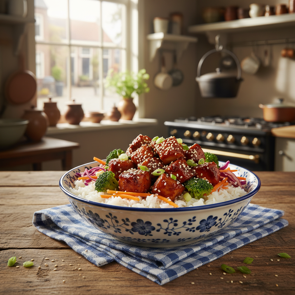 Een verrassende bowl met gemarineerde kip, groenten en rijst. De zoet-hartige marinade en knapperige sesamzaadjes zorgen voor een smaakexplosie.